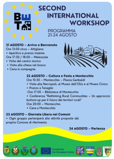 Le programme a combiné des moments culturels et conviviaux avec des activités axées sur l’Europe. Après l’accueil à Attigliano et la visite du village historique de Melezzole, la journée du 22 août a été entièrement dédiée à Montecchio, avec un parcours à travers son patrimoine historique et culturel – de la nécropole au Musée de l’Huile et au Musée Civique – et la conférence centrale du projet : « Repenser les Communautés Rurales – Une approche ascendante pour l’avenir des territoires ruraux ».